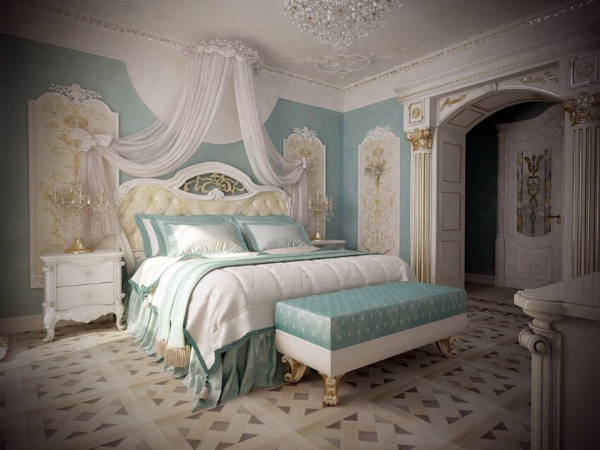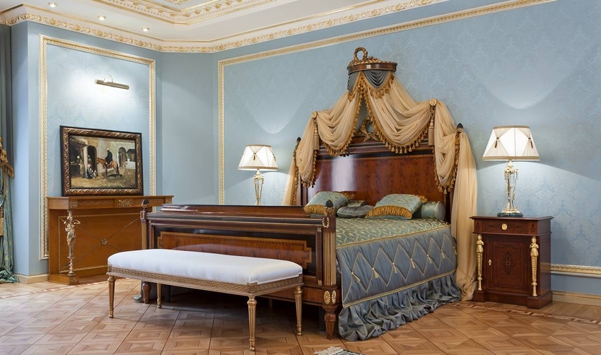 Неоклассицизм. Голубой привнесет в интерьер торжественность и простор. Витиеватая мебель, необычные, но богатые принты. Темные массивные предметы станут завершающим акцентом.
