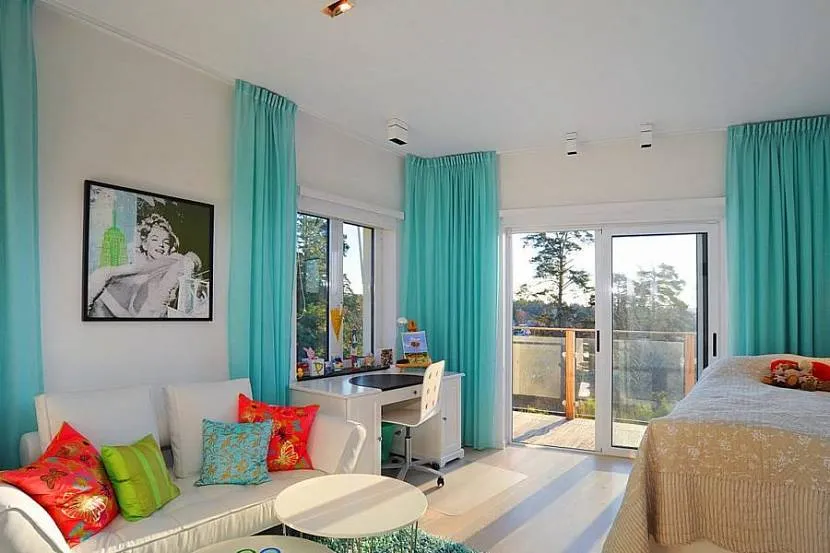 Бирюзовые шторы в интерьереИсточник podvenec.msk.ru/