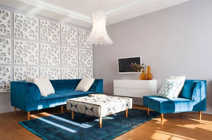Серые с голубым обои для гостиной рекомендуется выбрать с растительным, классическим или геометрическим орнаментом.