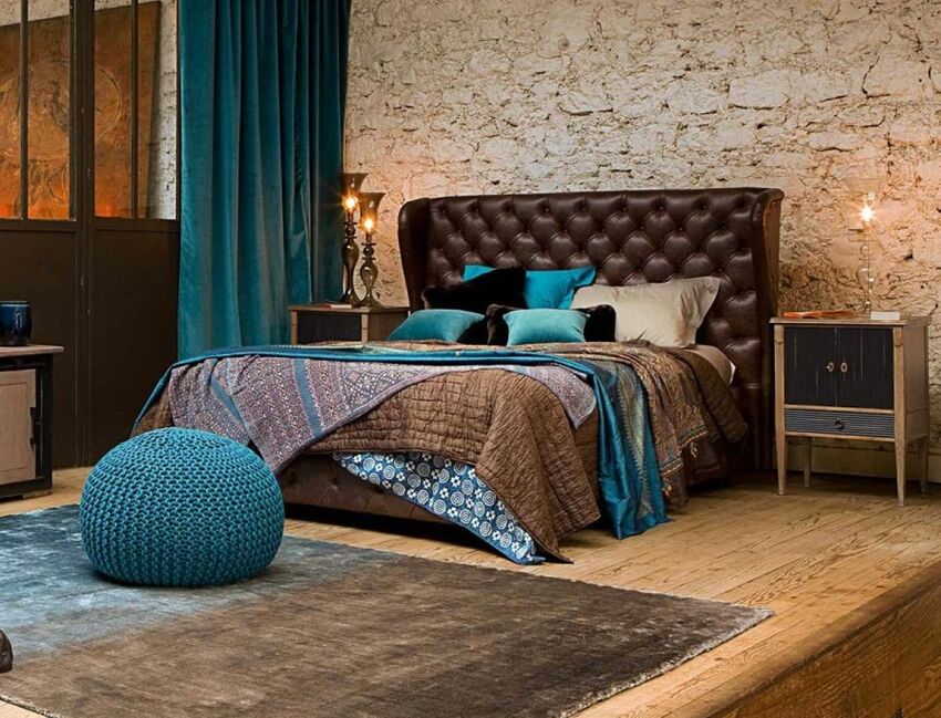 В таком интерьере голубая кровать будет выглядеть уместно и не потеряется на фоне отделки.