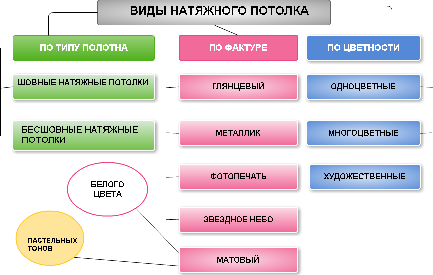 Исходя из материала полотна, натяжные потолки разделяются на две большие группы: