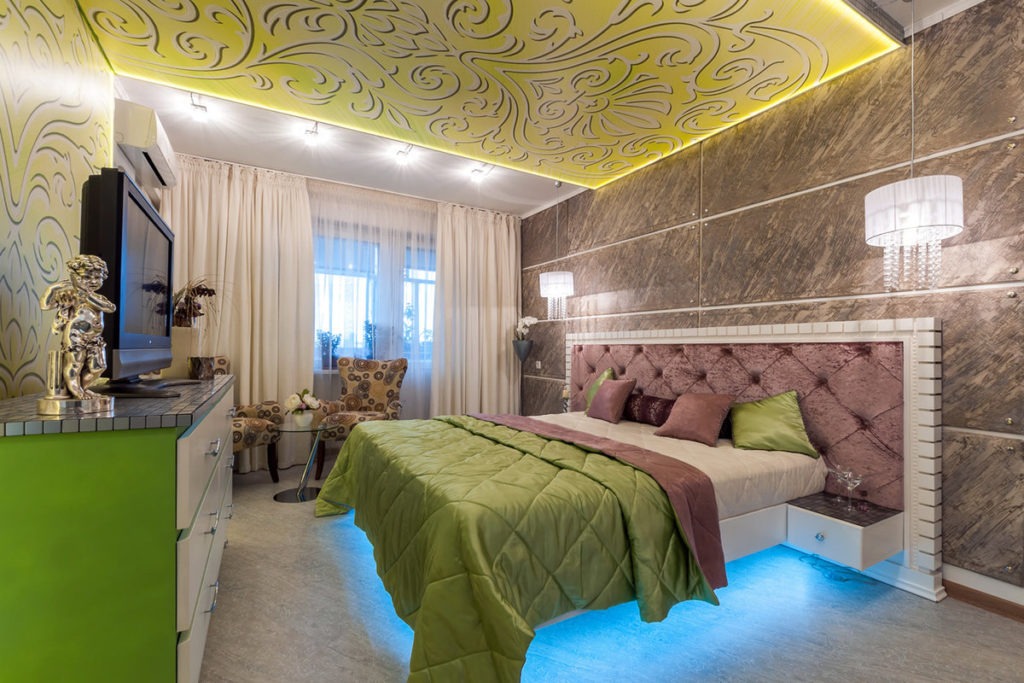 Сочетание гипсокартона и обоев позволяет выделить спальную зону у изголовья. Акцентирование потолочного выступа точечными светильниками по контуру уровня обеспечивает должный уровень света, ленточная подсветка усиливает разноуровневость потолка.