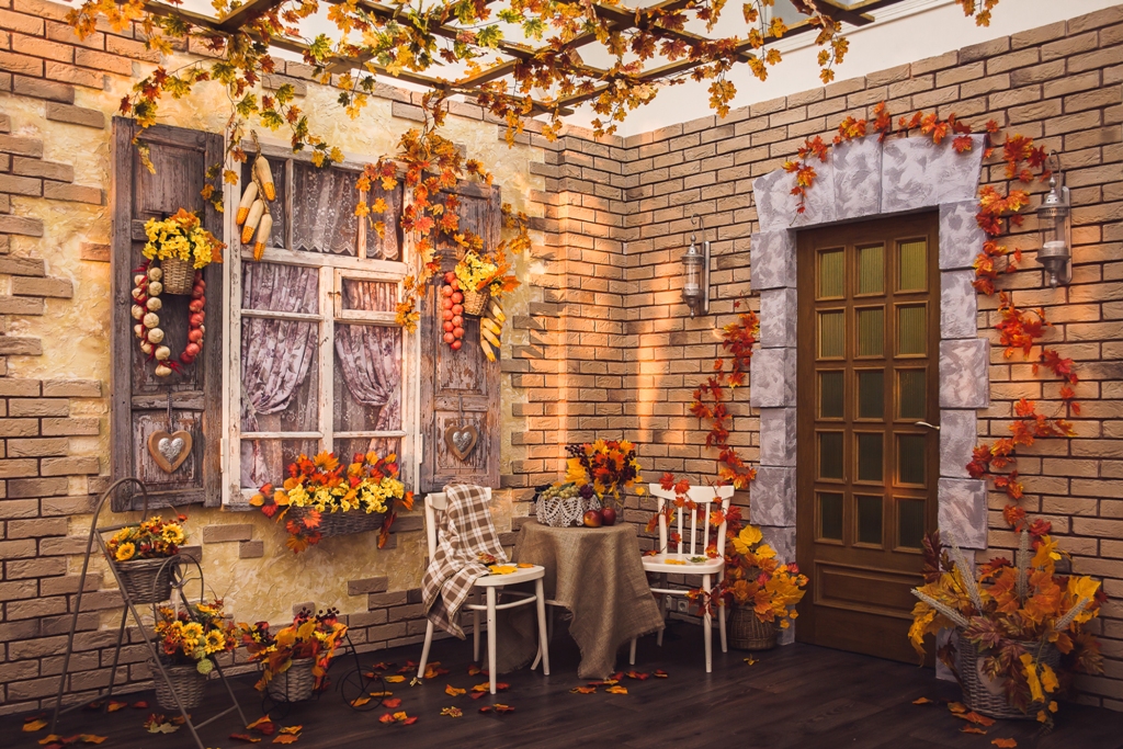 В украшении веранд появляется возможность использовать объем. Тут на особое место выходит тема урожайности. Преобладают тыквы, яблоки, баклажаны, кукуруза, грибы и яркие овощи. Появляется больше возможностей обыграть зонт и осеннюю сырость.