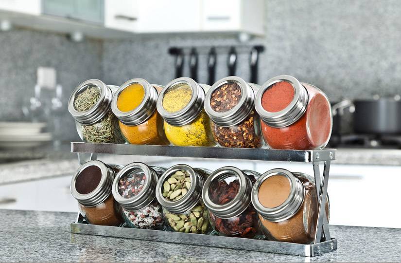 Баночки для хранения специй на кухне таким методом стоит подобрать из затемненного стекла или пластика, так как в нише дверей не будет. Те специи, которые используются чаще всего, можно хранить в любых банках, так как испортиться они просто не успеют.