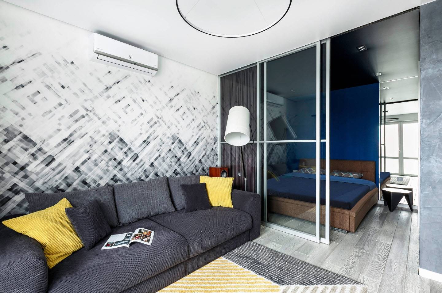 Кровать спрятана за перегородкой из матового стекла в гостиной