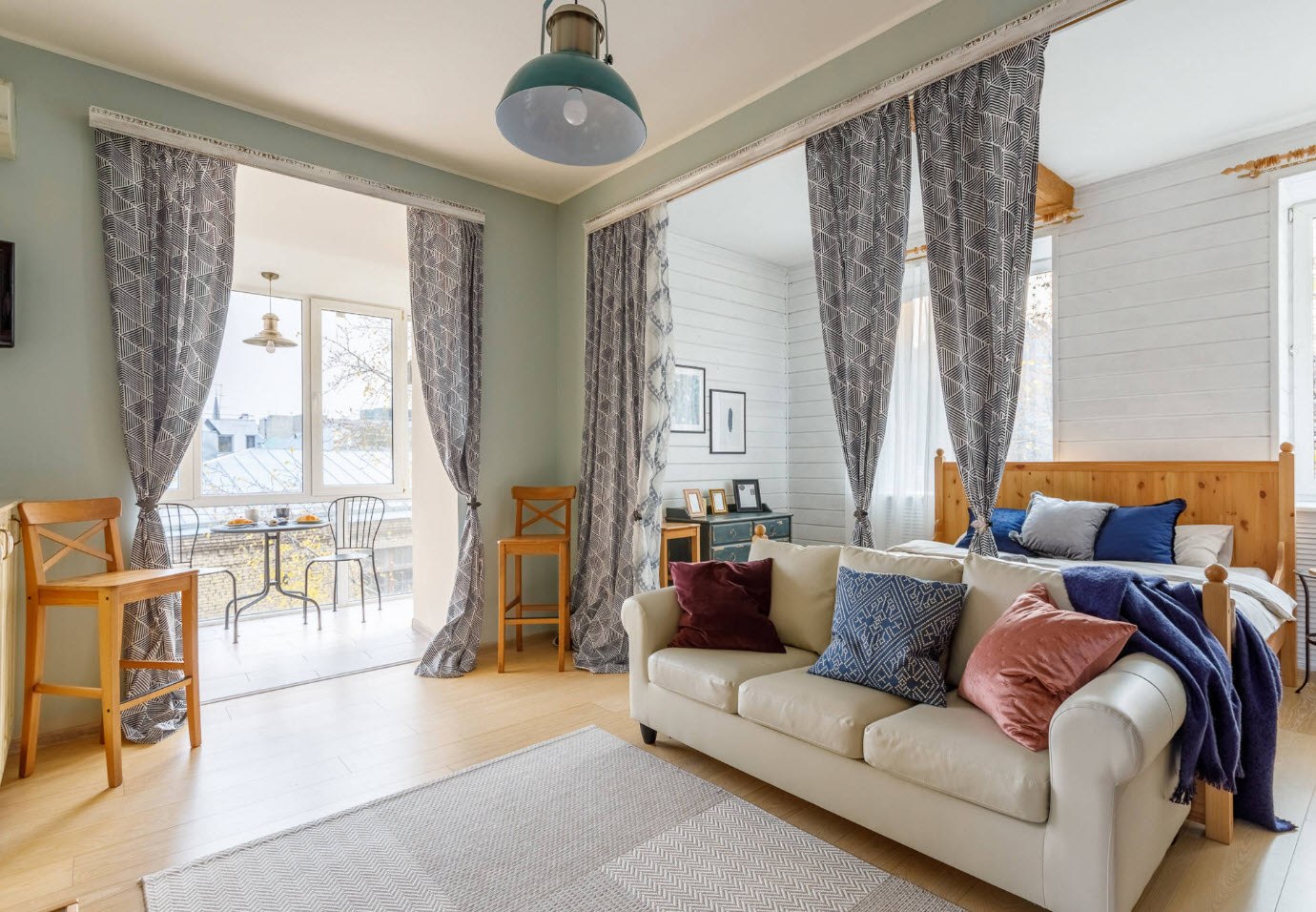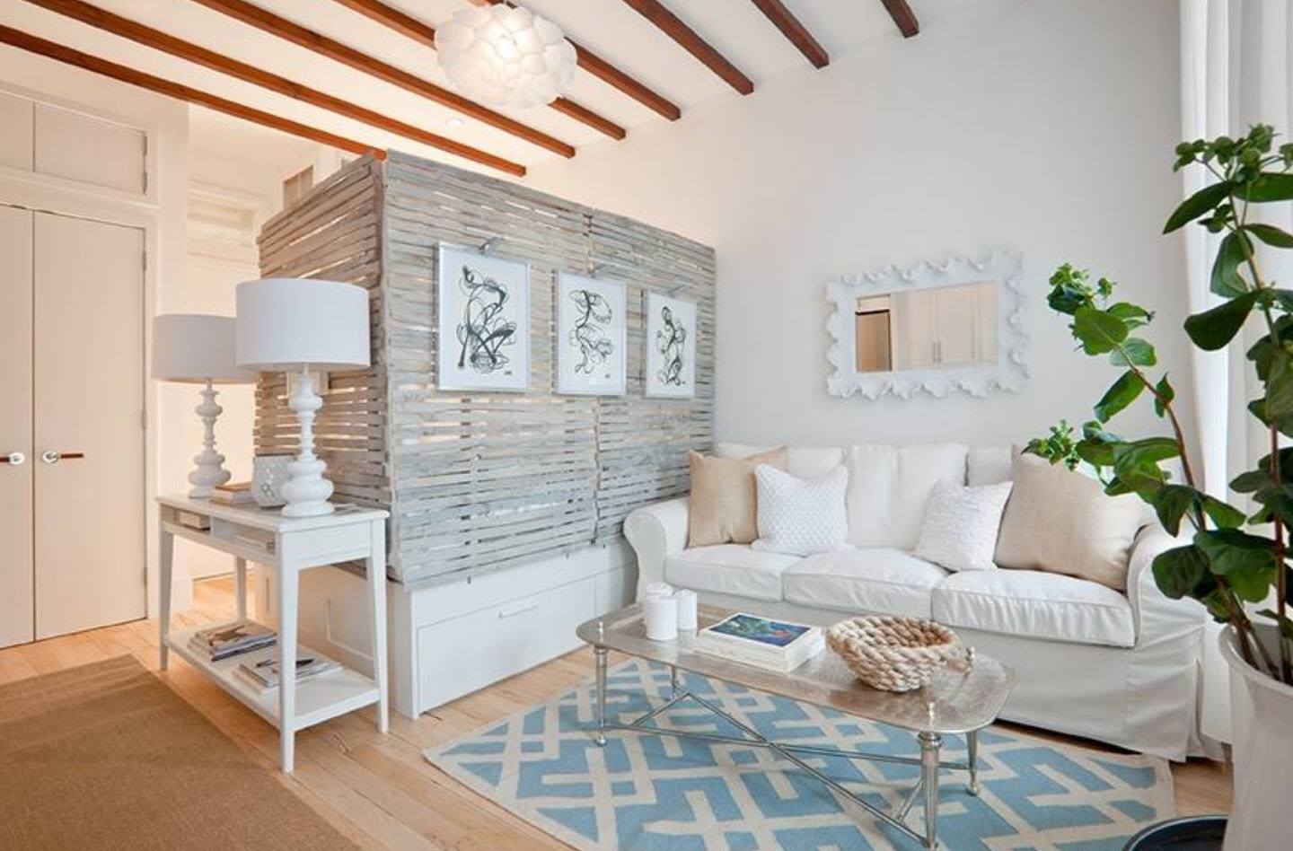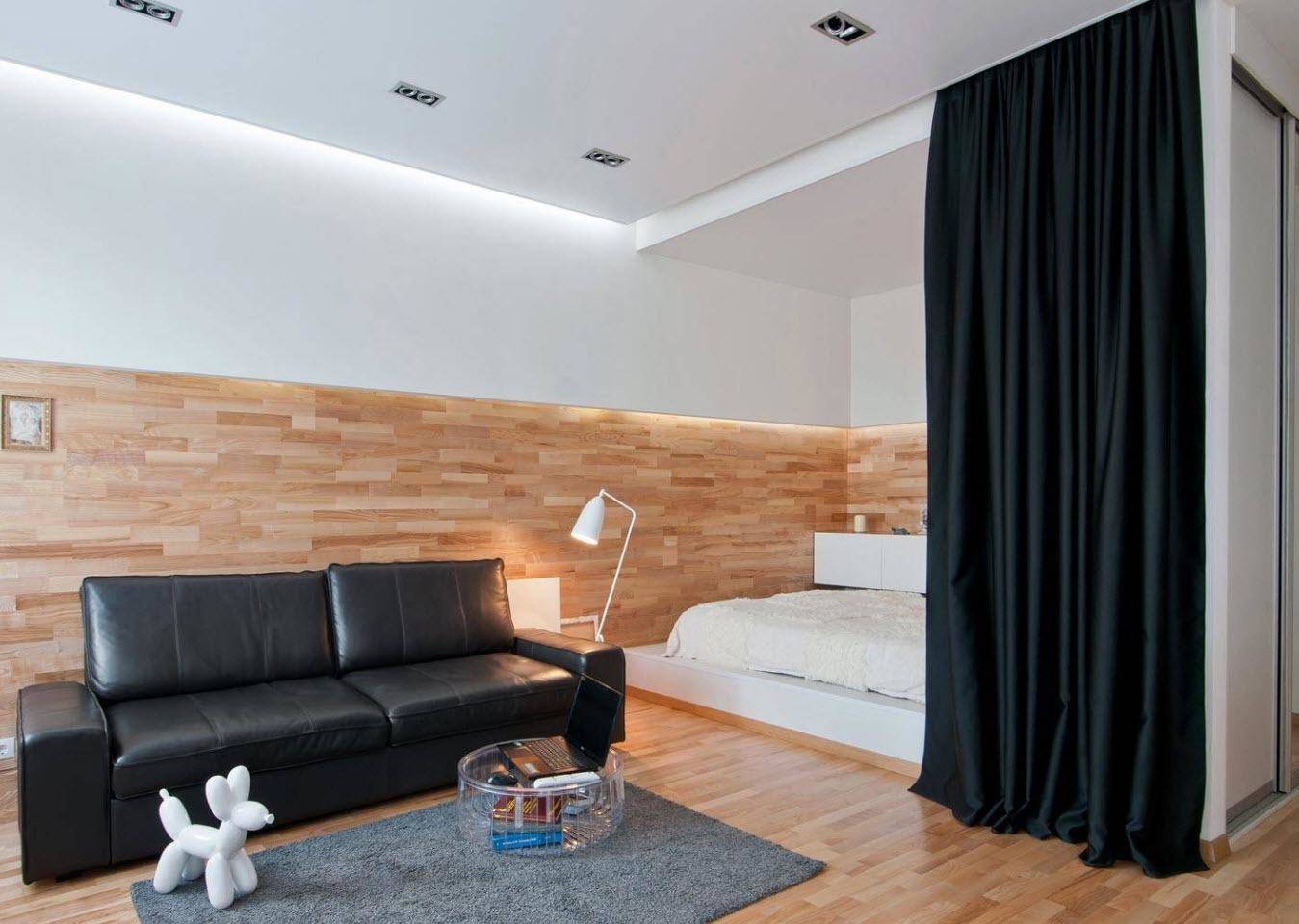 Зону сна можно отделить от остальной части гостиной, повесив тонкую ткань или толстую занавеску на карнизе. Следует выбирать тип материала, соответствующий стилю гостиной.