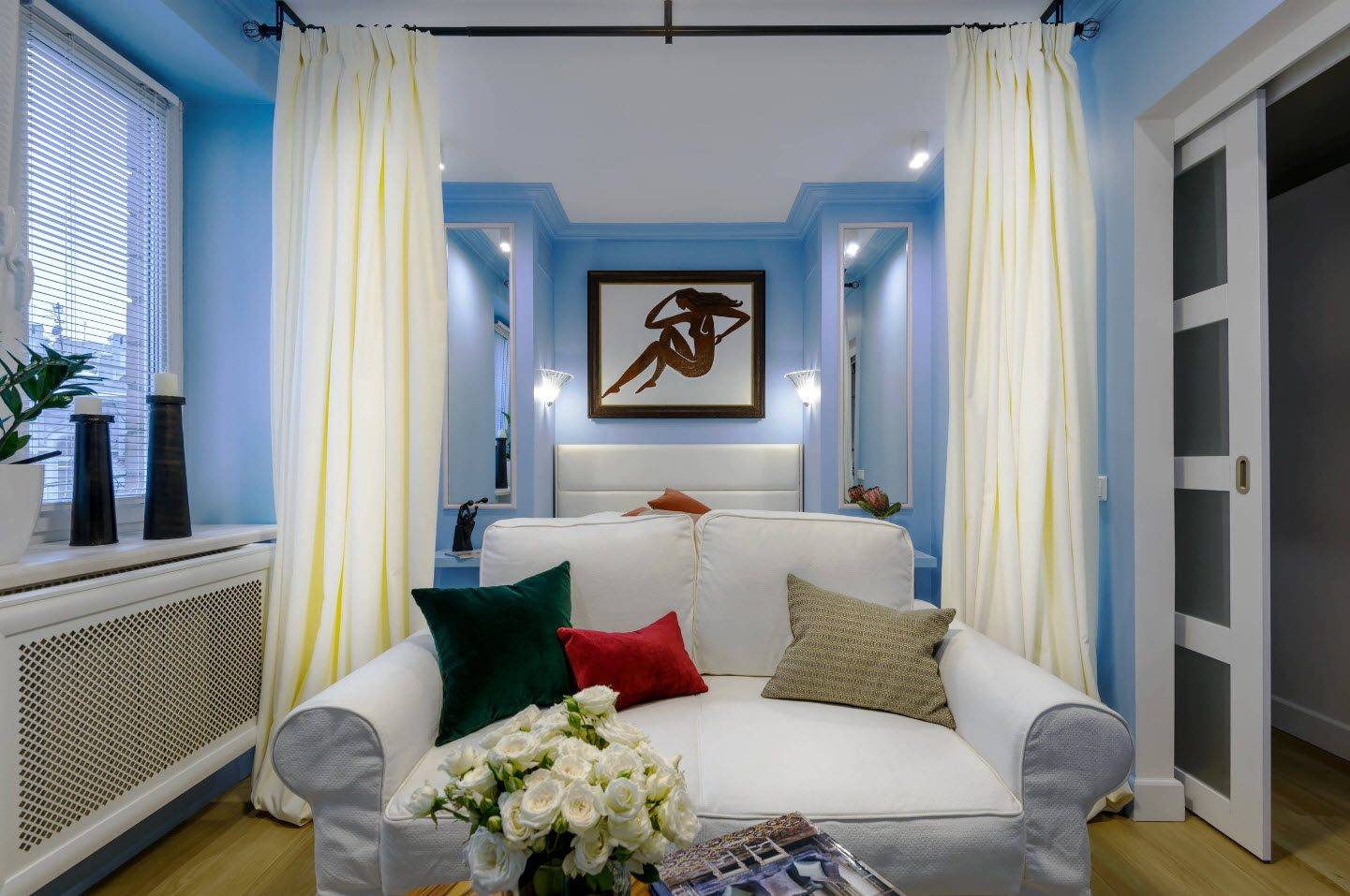 Кровать в гостиной можно спрятать в нише и завесить плотными шторами