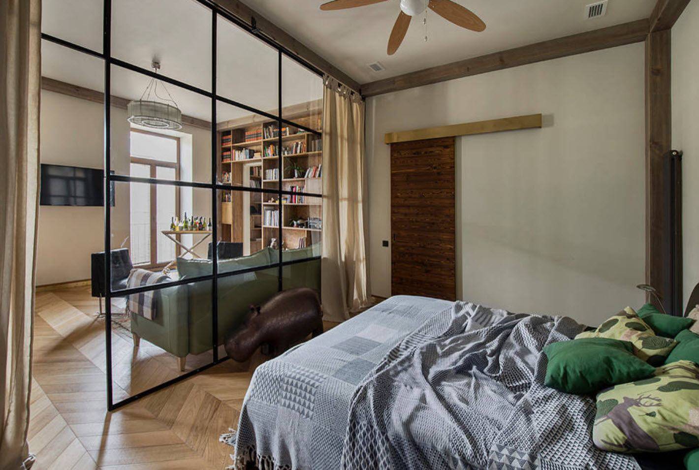 - Перегородка из матового стекла или пластика. Граница между спальней и гостиной останется очевидная, а вот естественного света во всей комнате станет значительно больше. Помещение останется легким, светлым и просторным. Чтобы стеклянная стена выглядела интересной и оригинальной, можно украсить ее витражом. Этот вариант подойдет тем, кто чувствует себя как в аквариуме.