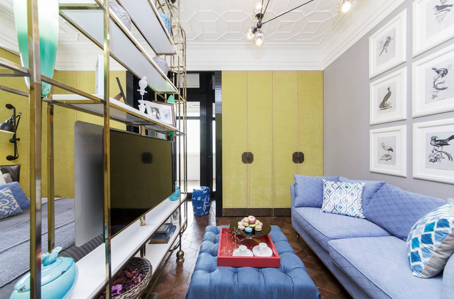 Получается гостиная спальня без уменьшения площади гостиной. Можно даже сделать помещение еще более многофункциональным: в отгороженном мебелью пространстве устроить рабочее место или мини-кабинет. Это — отличный вариант для маленькой квартиры-студии в которой проживают молодые люди.