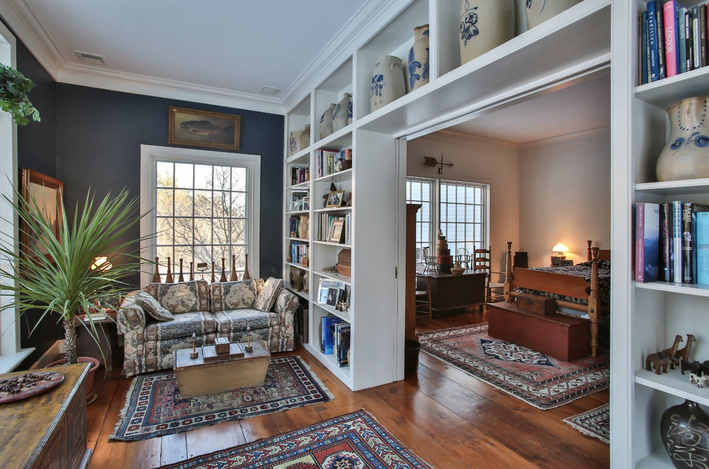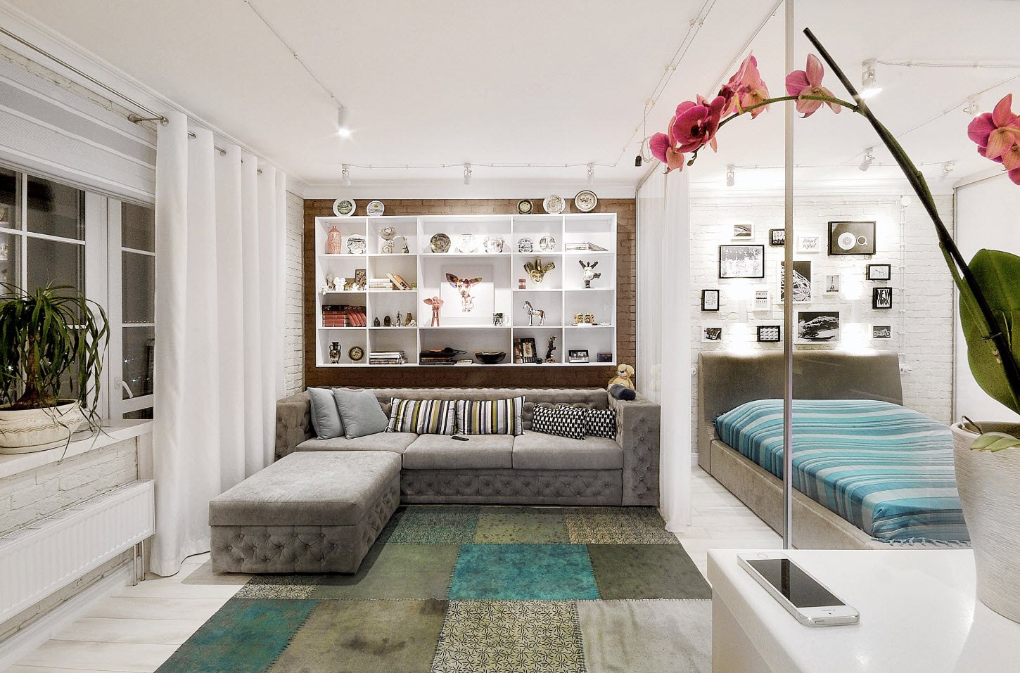 Отделить диван от кровати можно с помощью открытого стеллажа без задней стенки