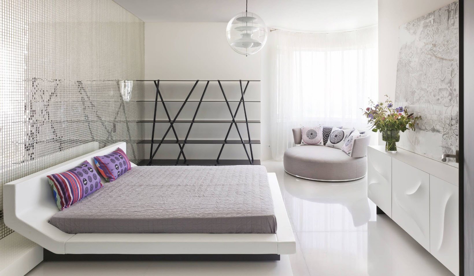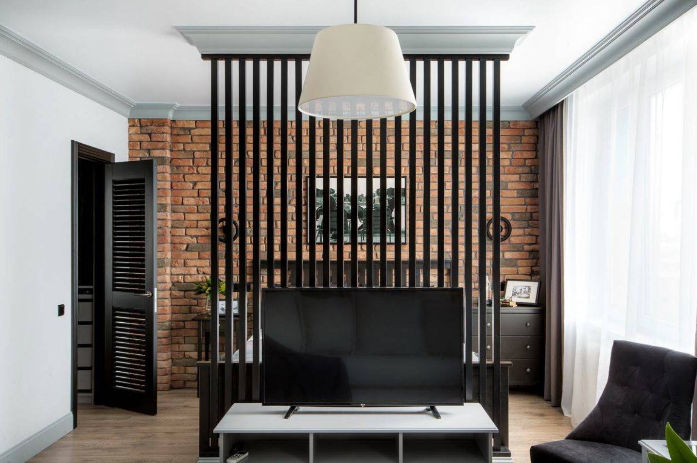 Зонирование гостиной и спальни сделано при помощи декоративной перегородки в японском стиле