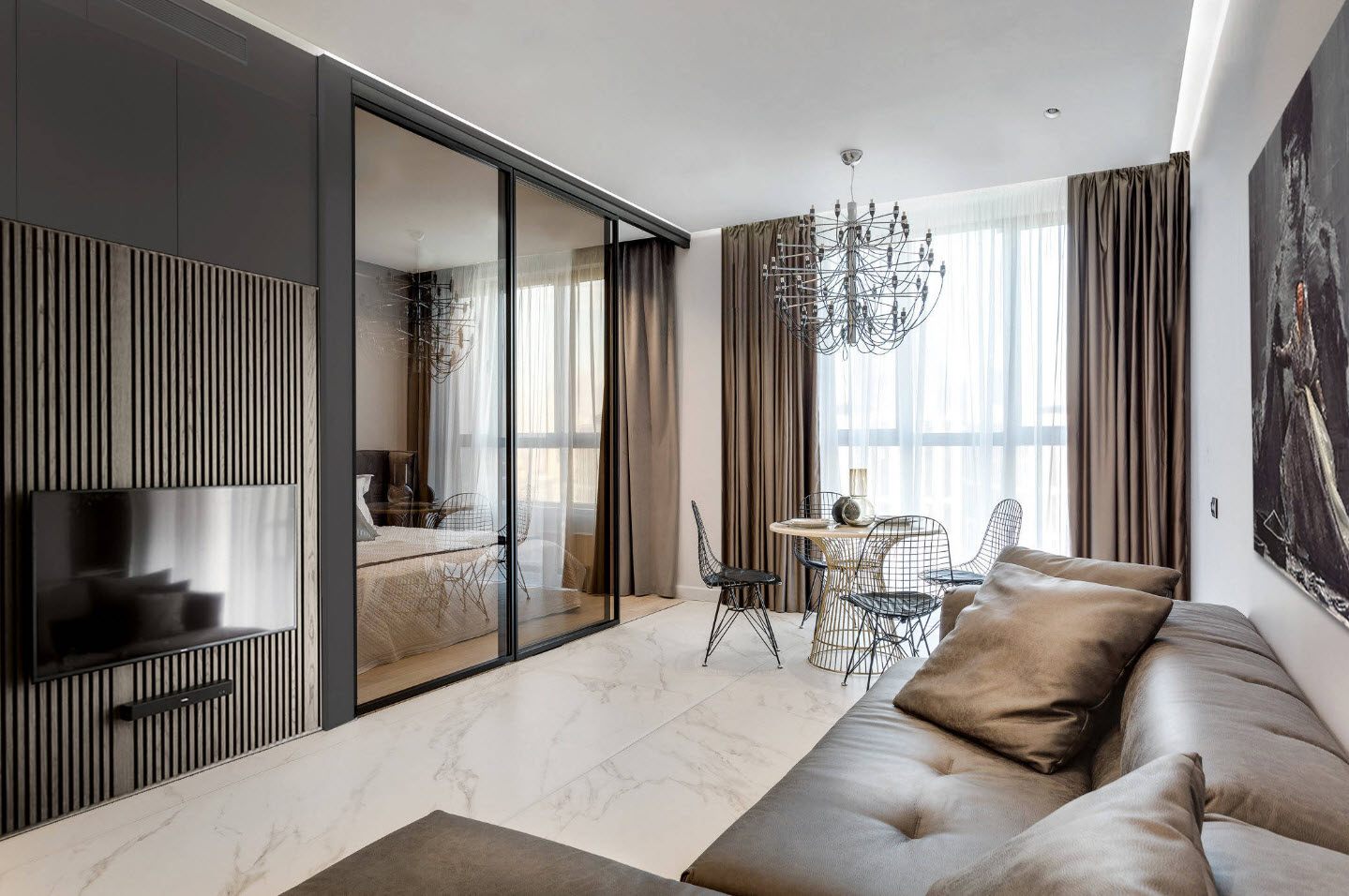 Если в помещении нет проблем с естественным освещением, то можно отделить гостиную от спальни при помощи шкафа-купе. Таким образом, в доме появится дополнительная система для хранения вещей. Сделайте на нем зеркальные створки и пространство визуально увеличится.