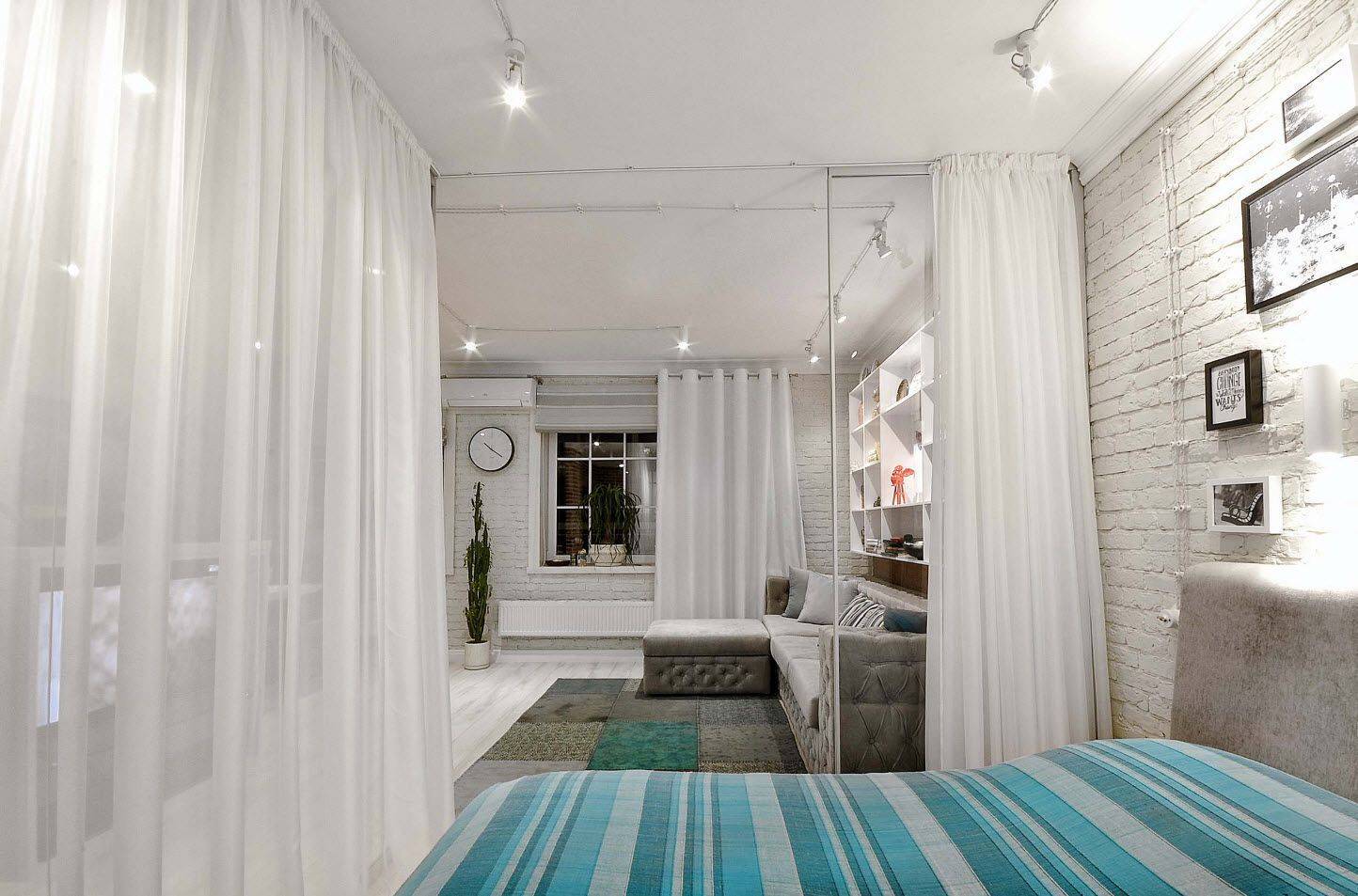 Если у вас имеется небольшая комната размером примерно 18 квадратных метров, то использование перегородок невозможно. В этом случае для зонирования подойдет текстиль. Например, это могут быть бамбуковые или обычные плотные шторы. При этом они должны легко и быстро собираться. При этом для окон используйте плотный и темный текстиль, который поможет добиться приватности. А на границе спальни и гостиной лучше повесить воздушный и легкий текстиль. Можно рассмотреть современные шторы из бусин – кисею.
