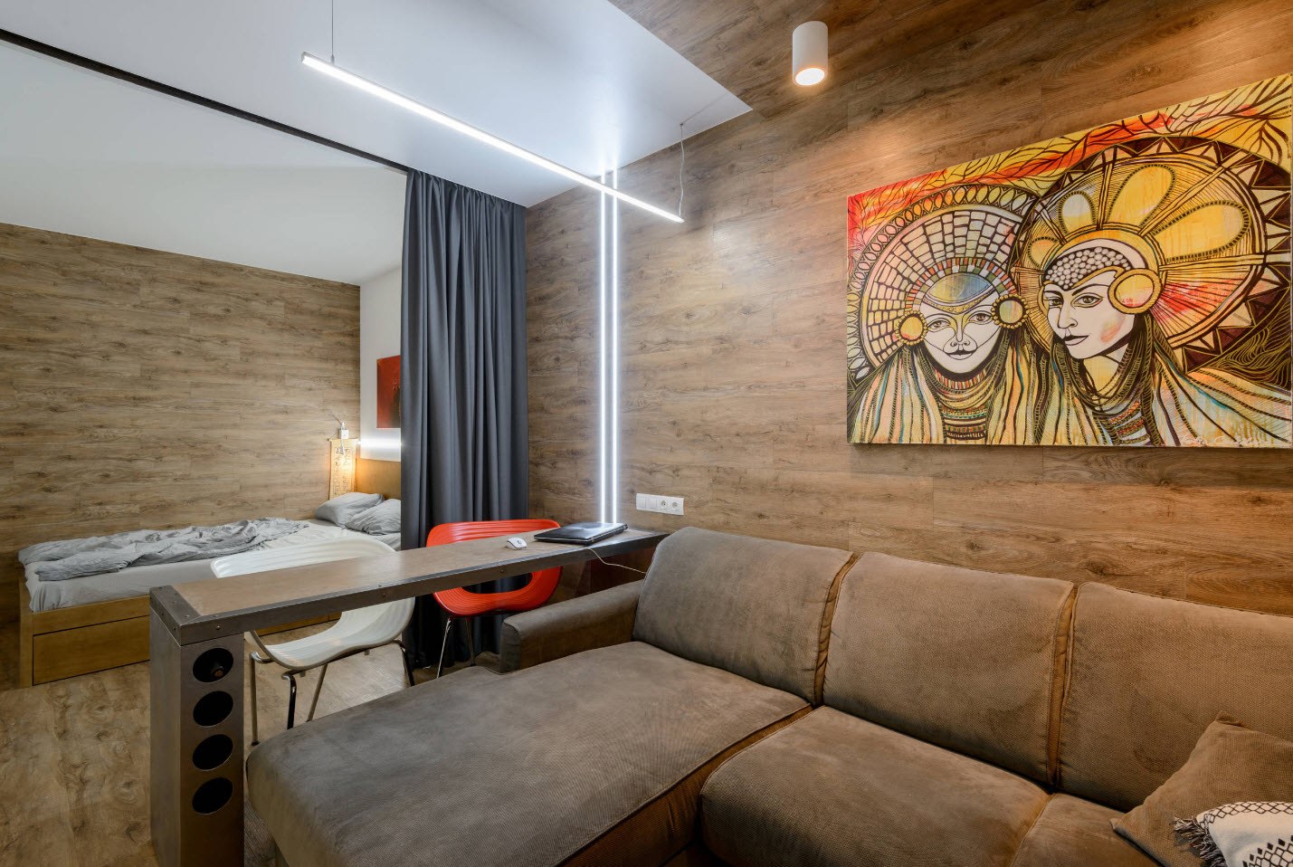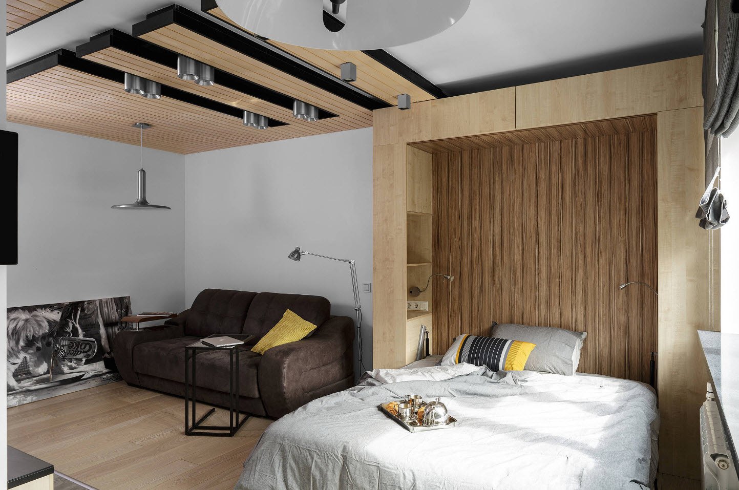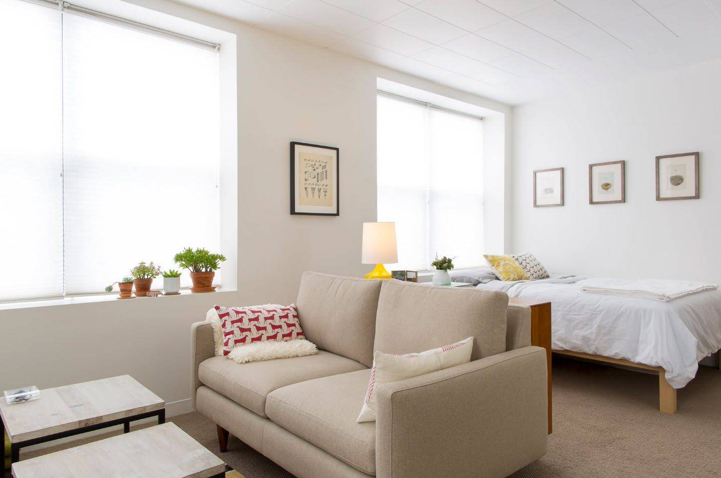 Независимо от того, есть ли у нас небольшая квартира, скромная студия или постиндустриальный чердак, каждый желает дома полноценно отдыхать. Некоторые люди считают, что в совмещенной спальне-гостиной наиболее уместен диван-кровать, так как другой вариант займет слишком много пространства. Однако, прежде чем отказываться от комфорта двухспального ложа, стоит проверить удачные примеры совмещения спальни и гостиной в одной комнате.