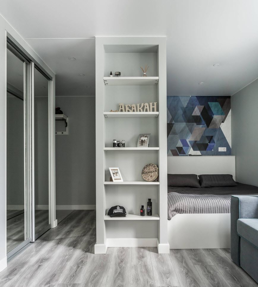 В современных интерьерах в качестве разделителя границ используется стеллаж открытого типа без задней стенки. Дополнительно на полках вы можете хранить вещи, книги и различные аксессуары. Помимо этого, он не препятствует проникновению солнечного света в комнату.