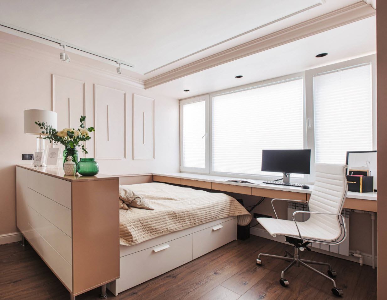 С помощью подиума комнату можно разделить на две зоны, одна из которых может быть рабочим кабинетом, а другая — гостиной. Вмонтированная в подиум кровать на ночь выдвигается на свое “рабочее место”, а днем обнаружить ее присутствие невозможно.