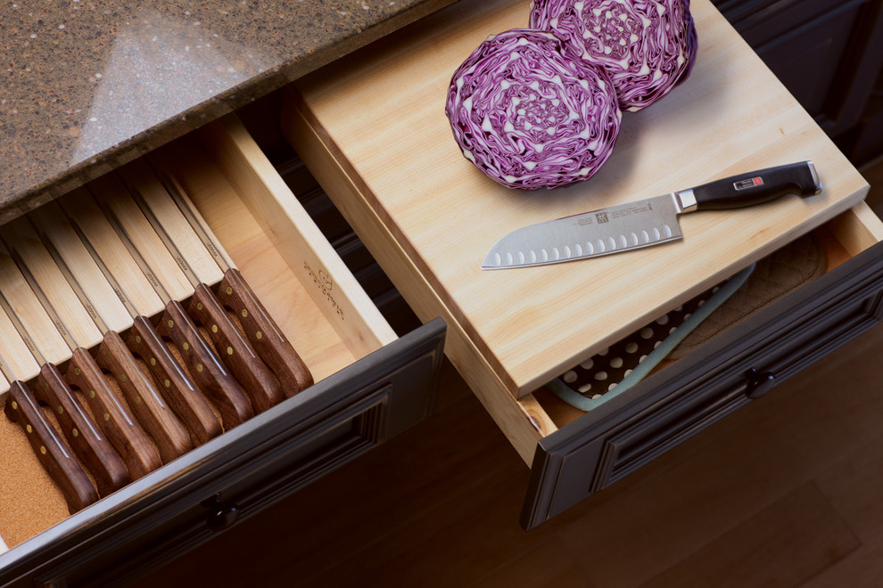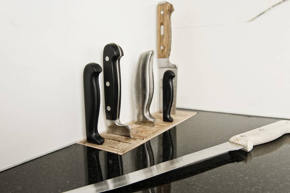 Если вы склоняетесь именно к этому варианту, вам нужно продумать и тот аспект, что отдельные ножи могут иметь слишком длинное лезвие, которое будет задевать расположенные ниже компоненты шкафа или попросту не войдёт в прорезь на всю свою длину. А это совсем не то, чего мы ждём от эргономичных решений. От чего-то придётся отказаться — либо от длинных ножей, либо от хранения вещей в нижней части шкафа.
