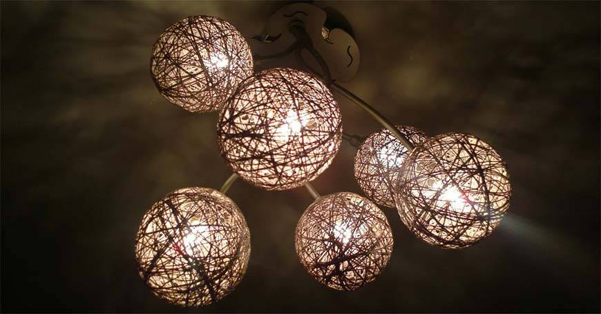 Хочется предложить еще одну идею, как можно украсить интерьер вещами из подручных материалов. Люстра из ниток выглядит довольно просто, но, несмотря на это, она способна стать изюминкой любого помещения.