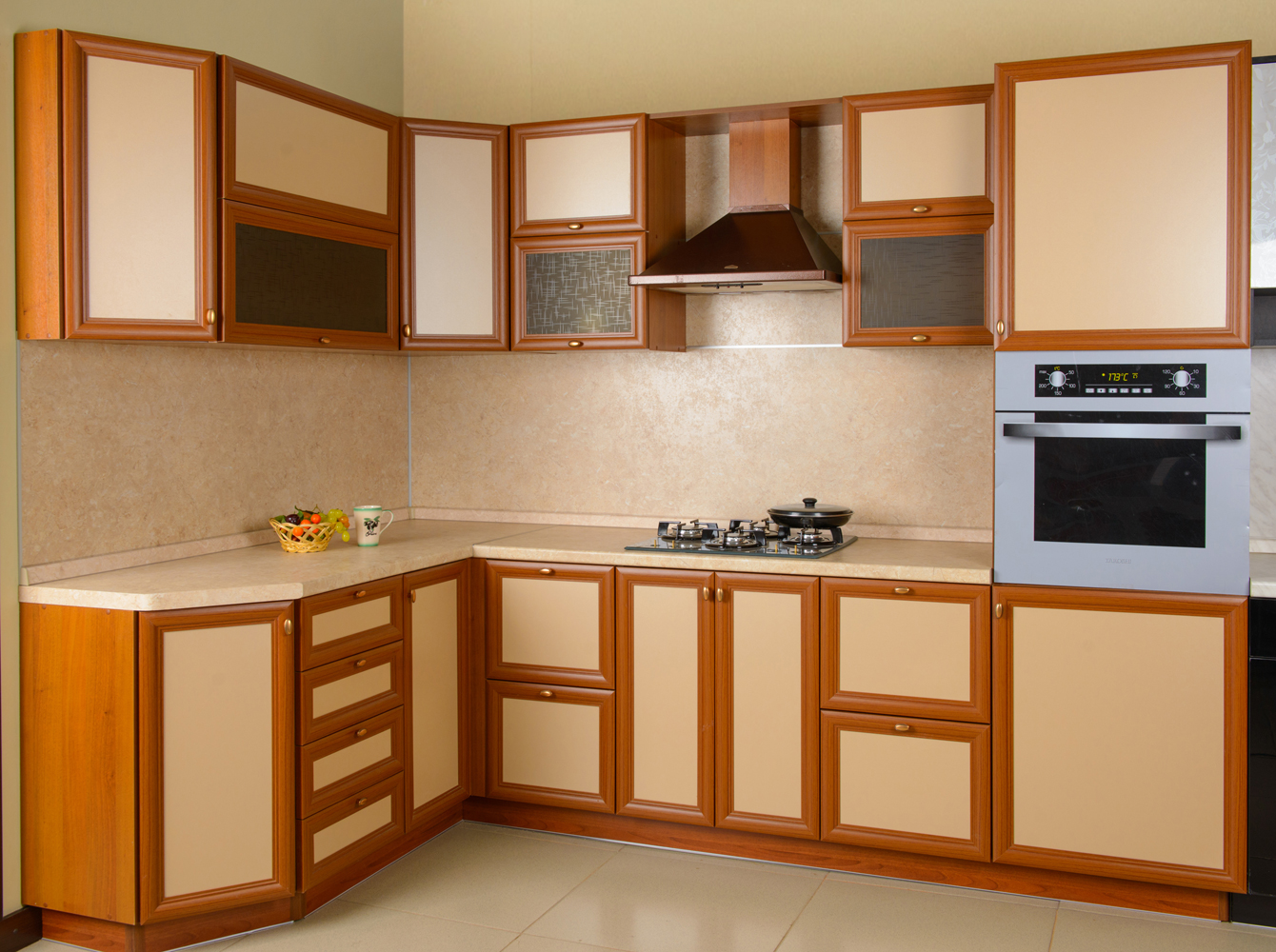 Выглядят респектабельно и красиво. Дорогие гарнитуры выполнены из цельного массива дуба или бука, ореха, черешни, ясеня, других твердых и полутвердых пород дерева. Их окрашивают в различные — чаще всего природные оттенки, покрывают лаком, патиной. Поскольку деревянные фасады ценятся за фактурность и естественный рисунок, их в основном делают цельными, без украшений или декорируют фальш-филенкой, резьбой.