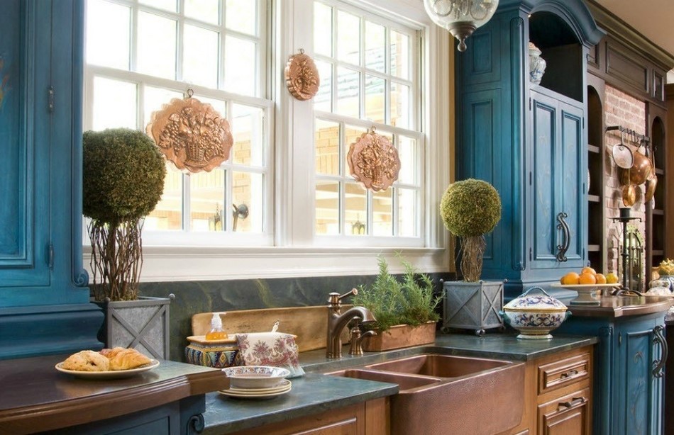 Кухонная мебель должна быть солидной и массивной, с крупными рельефными элементами декора. Правильно выбранная мебель — уже почти гарантированный отличный результат. Отлично подойдет искусственно состаренная поверхность, различные потертости и фактура антиквариата. Добиться этого можно и при помощи декупажа, либо можно реанимировать старинный гарнитур или заказать новый — все зависит от возможностей.