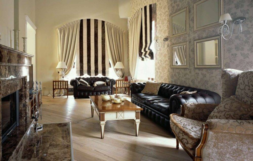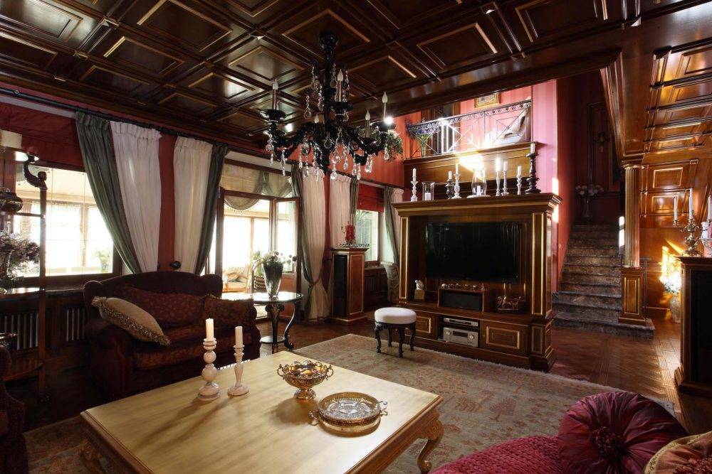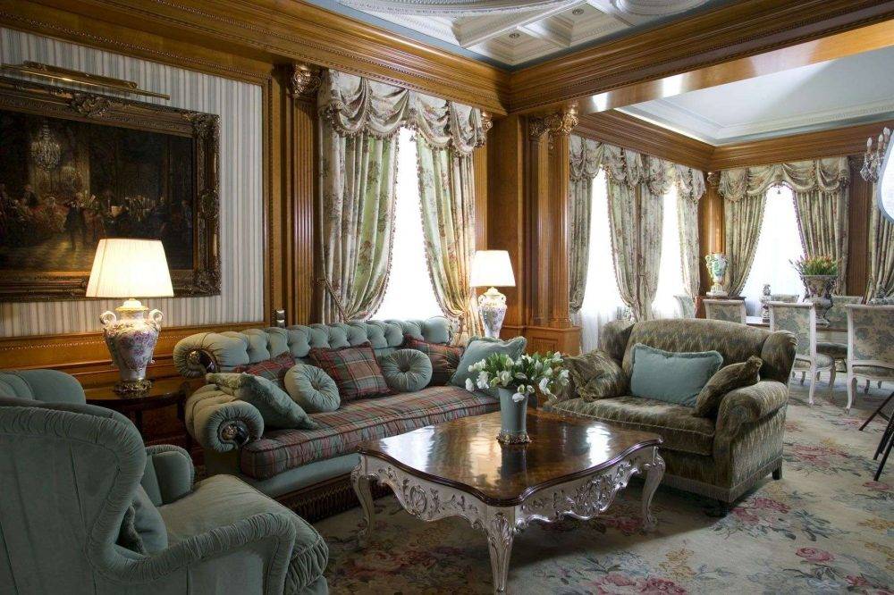 - старомодный и благородный, он содержит много традиционной мебели: мягкие кресла, пуфики, банкетки, диван, буфет, консоль, трюмо, стеллаж, комод;