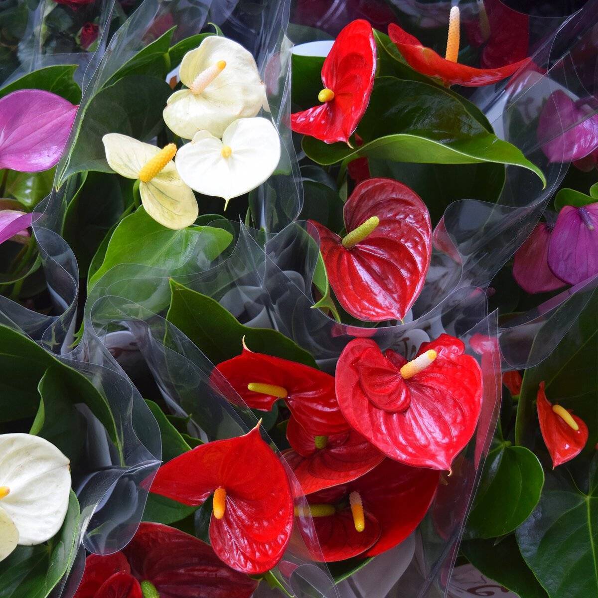 На полках магазинов встречается целый микс из различных сортов антуриума, выделяющиеся разными цветами покрывал.