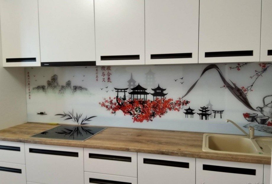 Фартук часто выступает главным украшением кухни в японском стиле. Его отделывают мозаикой под камень или скинали с японской тематикой – цветущими сакурами, домами с пагодами или надписями.