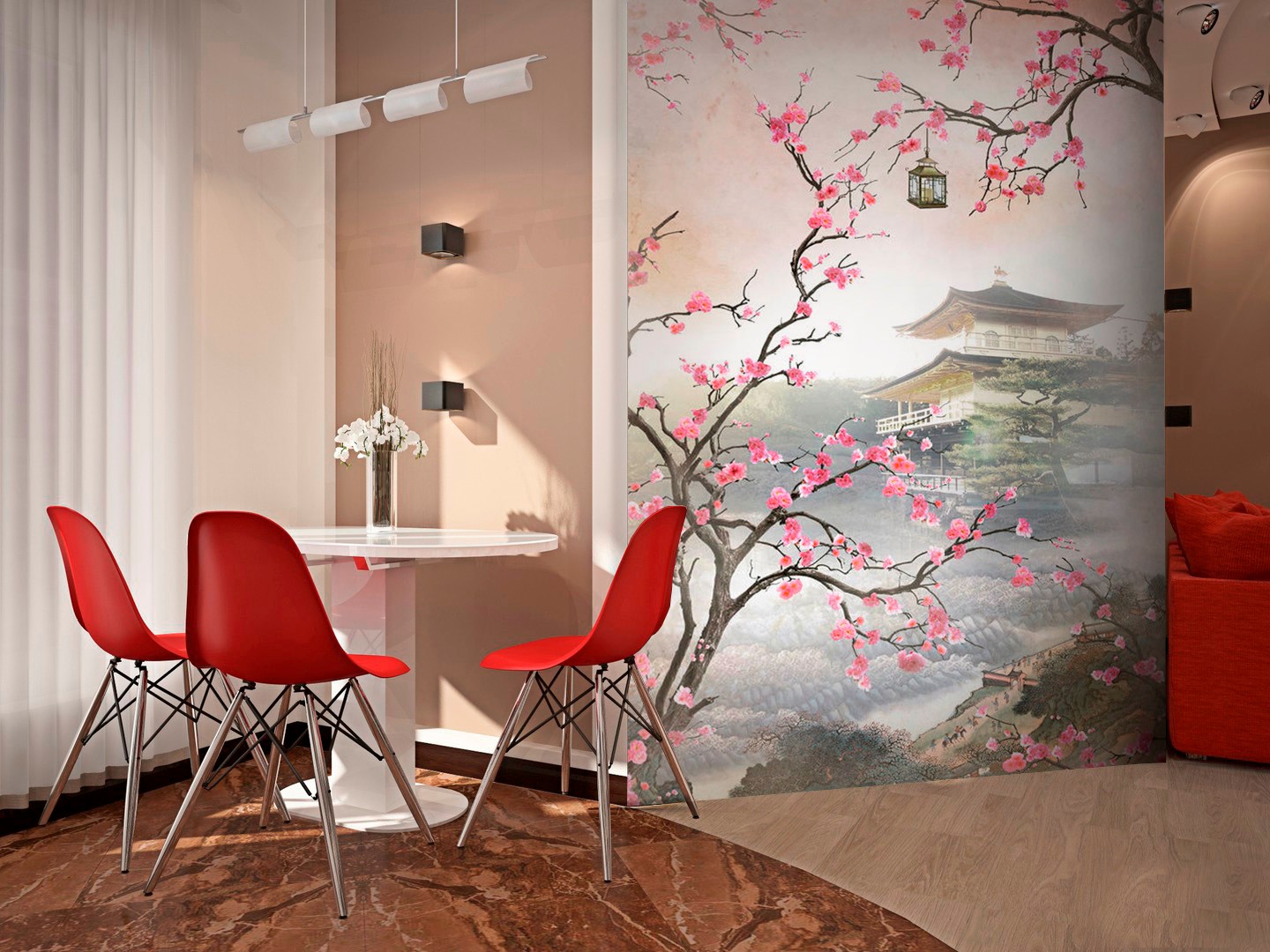 - Стены. Если говорить о стеновых покрытиях, то здесь можно применять декоративную штукатурку, однотонные обои или просто покрасить стены краской. Выделить, к примеру, обеденную зону можно с помощью деревянных панелей или бамбуковых обоев. А в качестве кухонного фартука установить скинали с изображением цветущей сакуры.