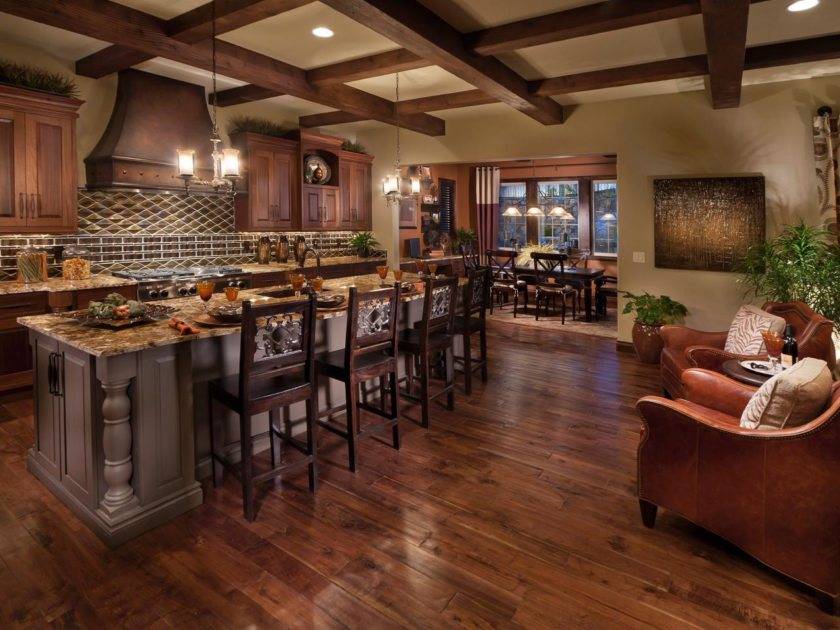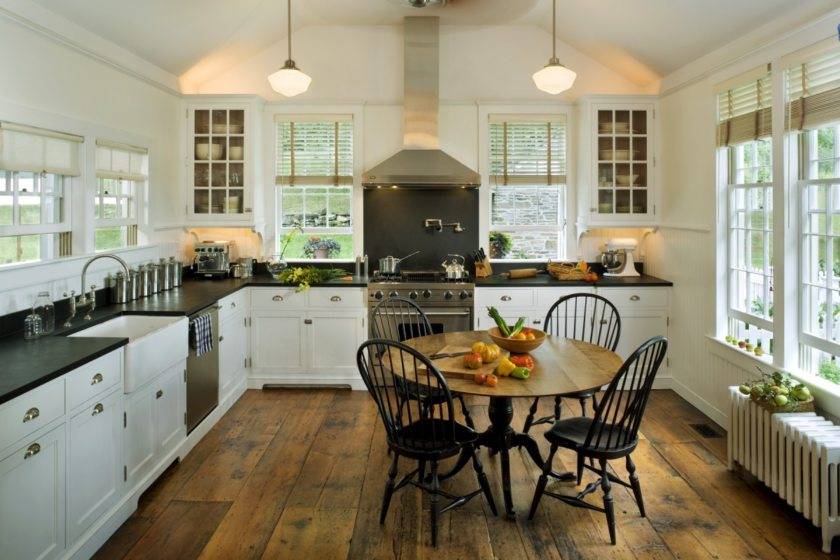 Для кухонного интерьера предпочтительно напольное покрытие в обеденной зоне и каменный кафель в рабочем месте.