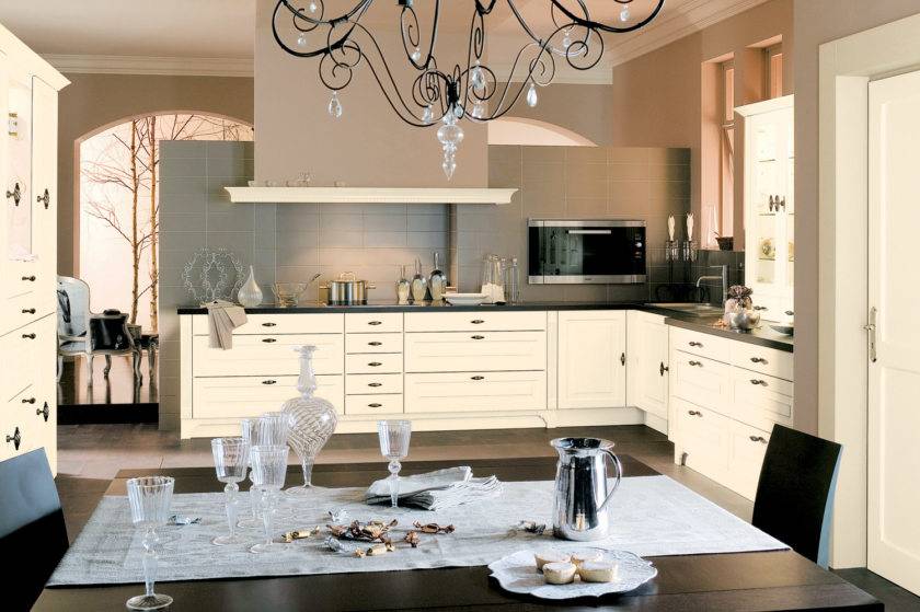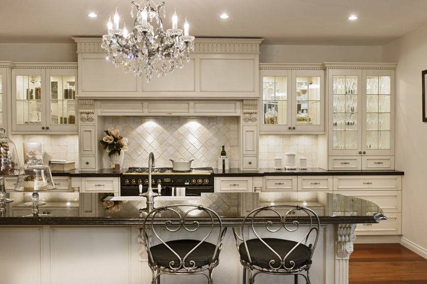 Осветительные приборы оформлены под свечи, которые горят, а также стилизованы резьбой из серебра, либо золота. Люстра из хрусталя в центральной части комнаты станет главным акцентным элементом в декоре кухни.