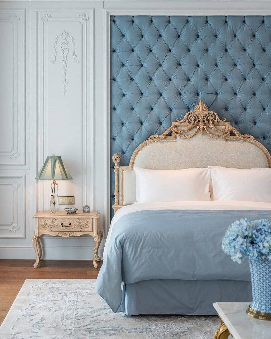 Спальня в стиле барокко чаще всего имеет большую кровать с текстильным изголовьем и стяжкой «капитоне», на деревянном каркасе и с резной рамой