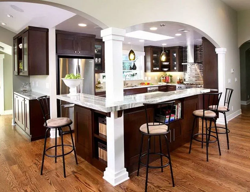 Очень интересным вариантом служит барная стойка, которая является продолжением арки. Устанавливать ее стоит только при наличии достаточного пространства. Это очень интересное дизайнерское решение. Барная стойка может служить дополнительным столом, расположенным между кухонной зоной и гостиной.