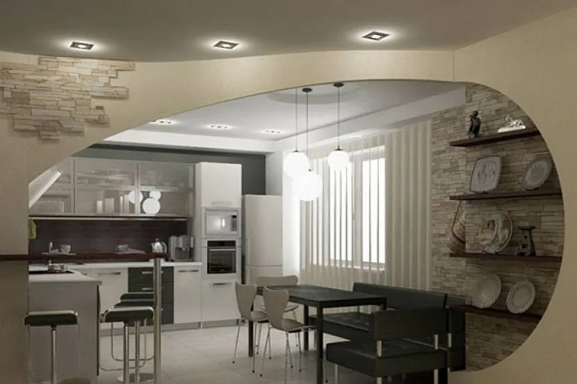 Единственный небольшой недостаток дизайна кухни с аркой это то, что шум и все запахи, возникающие во время готовки будут свободно распространятся через проход в другие комнаты.