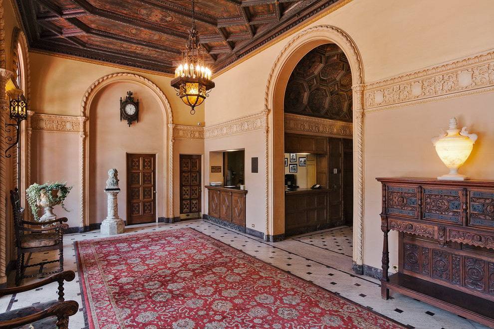 Портал Прямоугольная арка с различными элементами декора: витражные стекла, деревянная резьба.