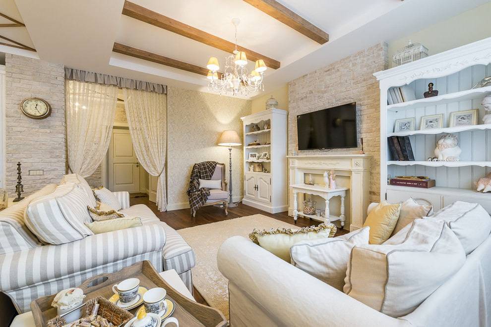 Дизайн гостиной с аркой, оформленной резьбой, обеспечивает максимальный комфорт, уют. Такой прием используется в деревенских стилях. Это обрамление будет идеально сочетаться с мебелью из дерева, натуральными тонами отделки, текстильного декора.