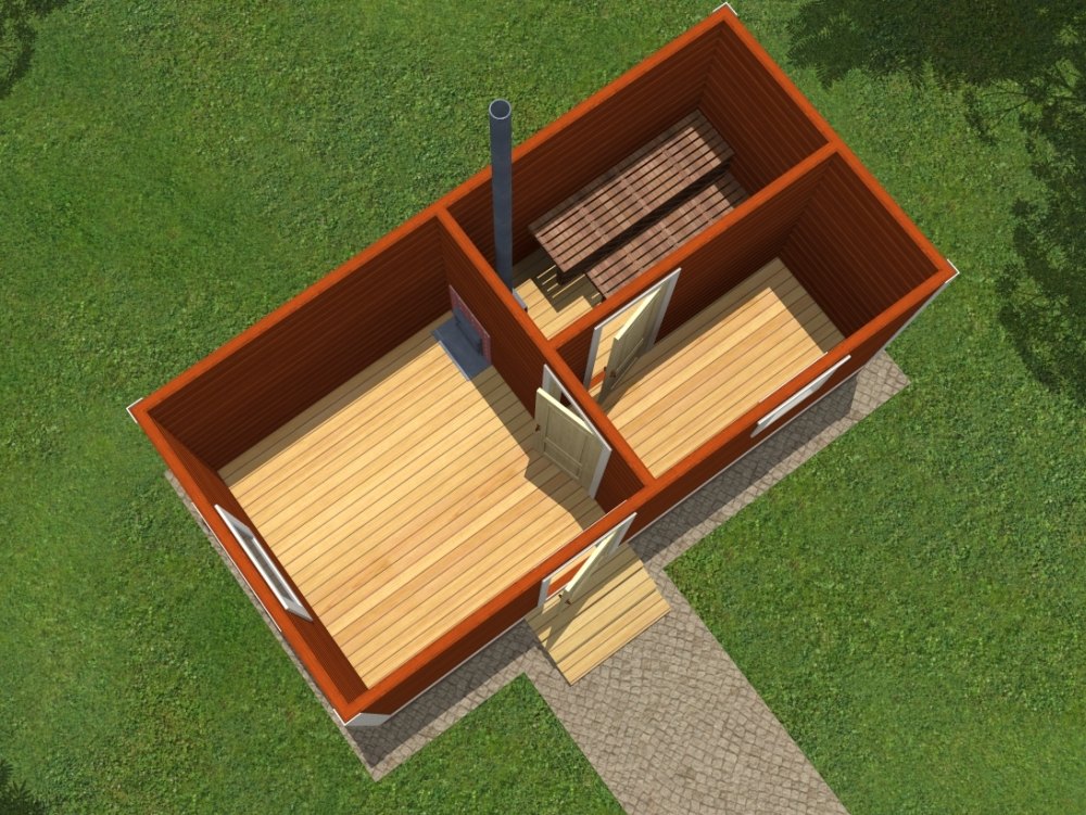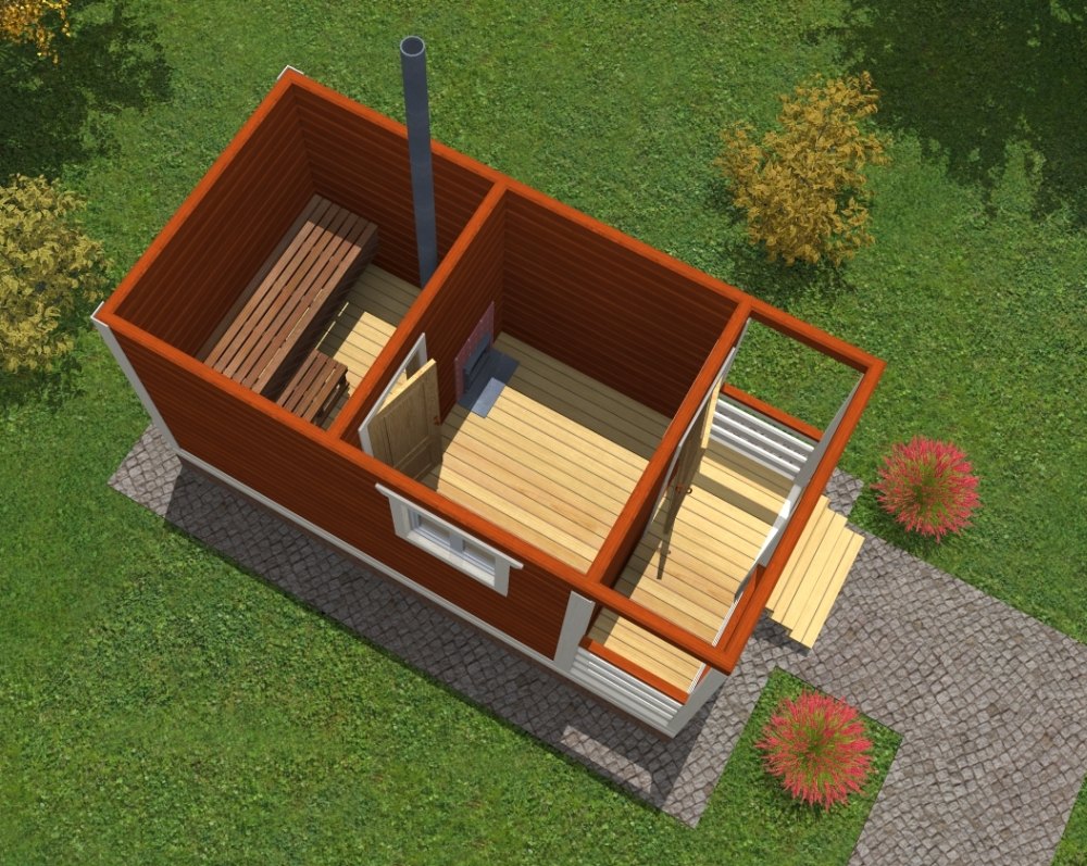 Она не обладает большим весом и габаритами, поэтому не требует серьезных геофизических исследований участка и может быть возведена без использования строительной техники и специалистов. То есть, удешевить проект можно, сделав чертежи на баню и выполнив основную часть работ самостоятельно.