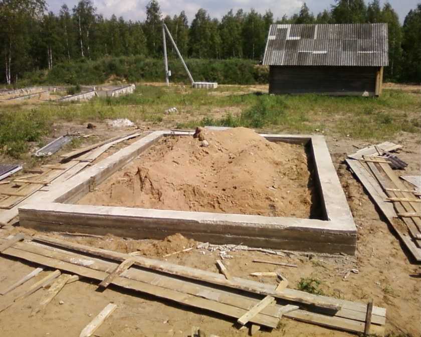 Для устройства ленточного фундамента, по периметру бани выполняют опалубку на глубину, превышающую сезонное промерзание грунта, устанавливают арматуру и заливают её бетоном. Для защиты от сырости фундамент должен возвышаться на 0,5 метра над землей. Внутри периметра фундамента выполняется отсыпка из щебня или песка.