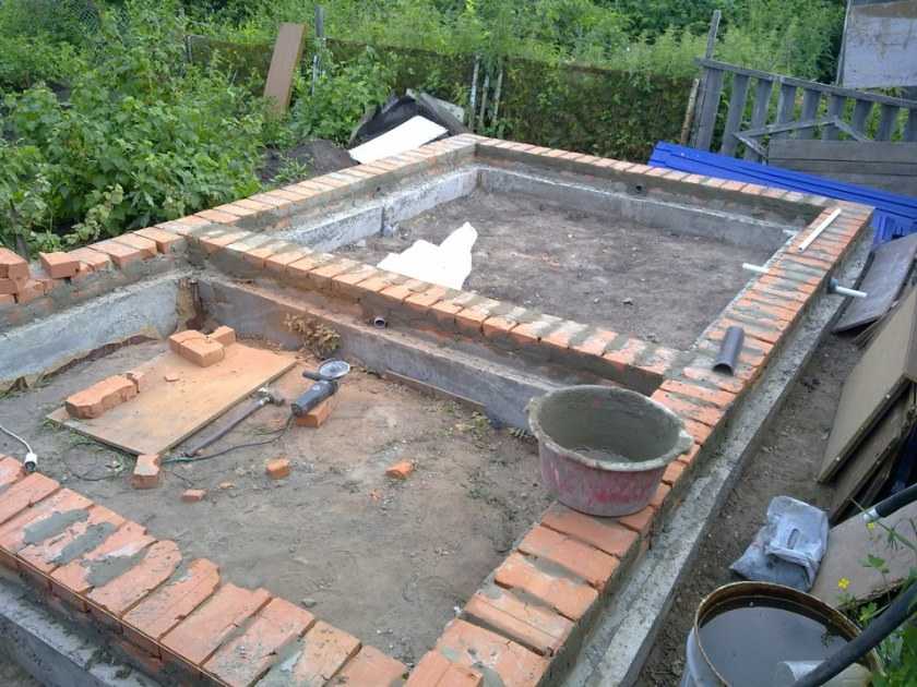 На построенный цоколь настилается качественный рубероид, который уберет влагу. Здесь вполне хватит слоя. По проведению подобных работ начинается укладка первого ряда, выполненного из кирпича или бруса, смотря, из чего строится баня. На данном этапе следует вырыть яму, примерно 1,8 метра в глубину. Она потребуется для обеспечения слива. В нее устанавливается бочка и желательно вверх дном. Именно к ней будет подведена труба слива, выходящая из бани.