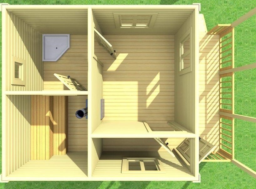 Готовая конструкция выглядит так: 2х6 м – для веранды, 4х4 м – для комнаты-предбанника, 2х2 м – место помывки, 2х2 – парилка. Вентиляция должна находиться на 20 см от почвы, в зимний период нужно закрывать отверстия заглушками.