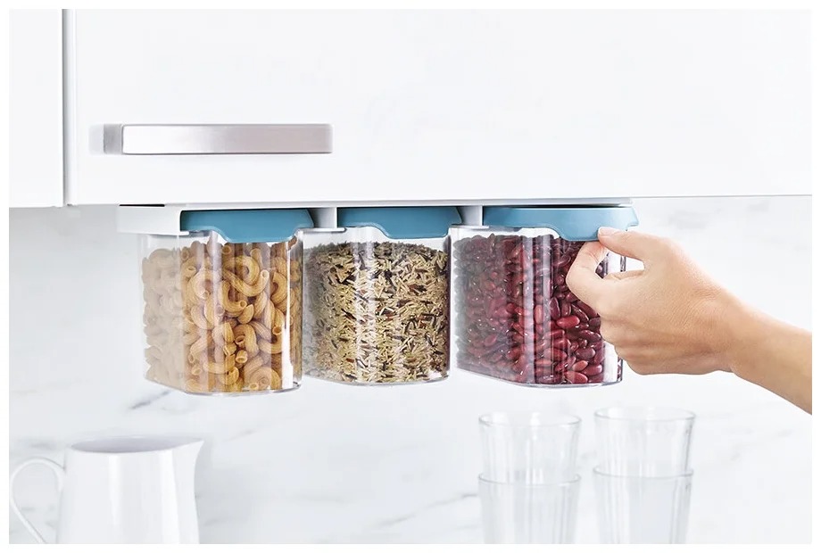 Еще одно интересное предложение от Joseph Joseph – серия из 3 баночек CupboardStore оптимальна для крупяных, макаронных изделий, орехов, а также сухофруктов. Благодаря нестандартному подходу к расположению контейнеров, конкретно их подвесному креплению, появляется шанс освободить как можно больше пространства в кухонном шкафчике.