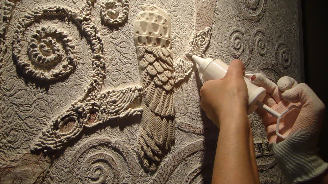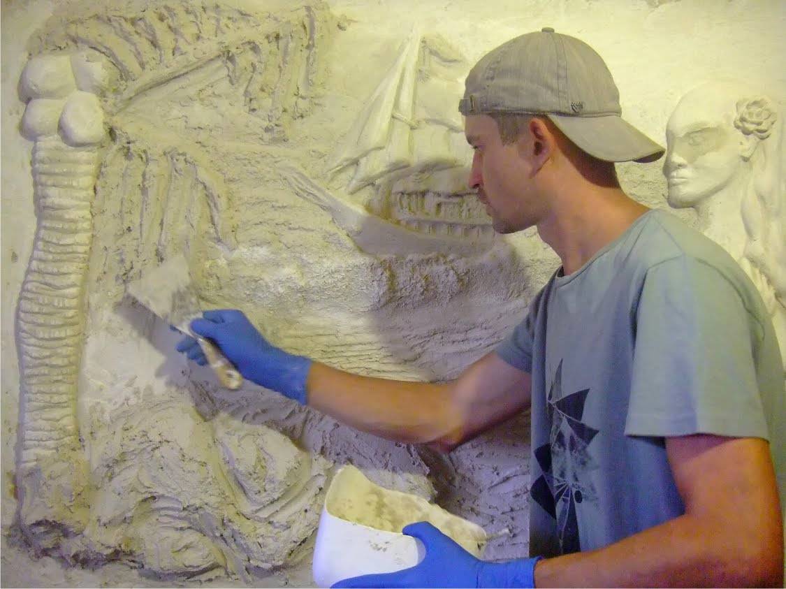 - Самый сложный и трудоемкий этап – нанесение на поверхность штукатурки или гипса и создание объемного изображения. Мелкие детали можно прорабатывать кисточками и даже пальцами. Запаситесь терпением!