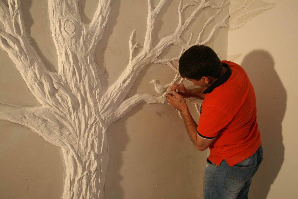 На углу стены предполагалась птица, которая будет сидеть на ветке и взлетать. Поэтому сделала из проволоки второй каркас дерева, опять налепила гипса и намотала бит, прикрепила аналогичным способом (саморезы). Снова по всей поверхности заготовки нанесла гипс и сформировала барельеф ствола дерева, который утопал в стену. Более тонкие ветви я уже рисовала прямо на стене гипсом, помогая себе ложкой, шпателем и ножиком, убирая все лишнее.