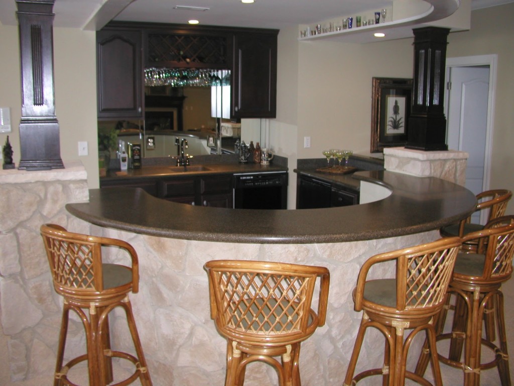 Барная стойка из камня смотрится стильно и дорого, стоит тоже дорого. Материал прочный, устойчивый к воздействию влаги и высоких температур, прост в уходе. На мой вкус проигрывает по важным параметрам искусственному камню. Можно выбирать, если позволяют деньги. Главный плюс — тактильные ощущения. Материал воспринимается монументальным и основательным, а это приятно. В живую никто не перепутает натуральный камень и имитацию из ламинированного ДСП.