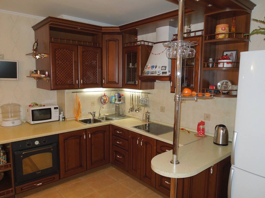 Кухня с барной стойкой из массива дуба и другого дерева смотрится очень круто, подходит и для классических и для современных стилей. Но дерево нежное (боится механических повреждений).