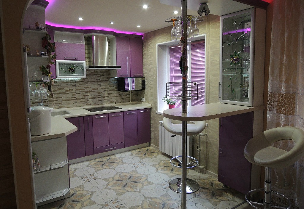 Если к кухне присоединен балкон, то площадь значительно увеличивается. В этом случае барная стойка отлично впишется на границе кухни и бывшей балконной части. При сохранении подоконника в виде перегородки, его часто переделывают под барную стойку.