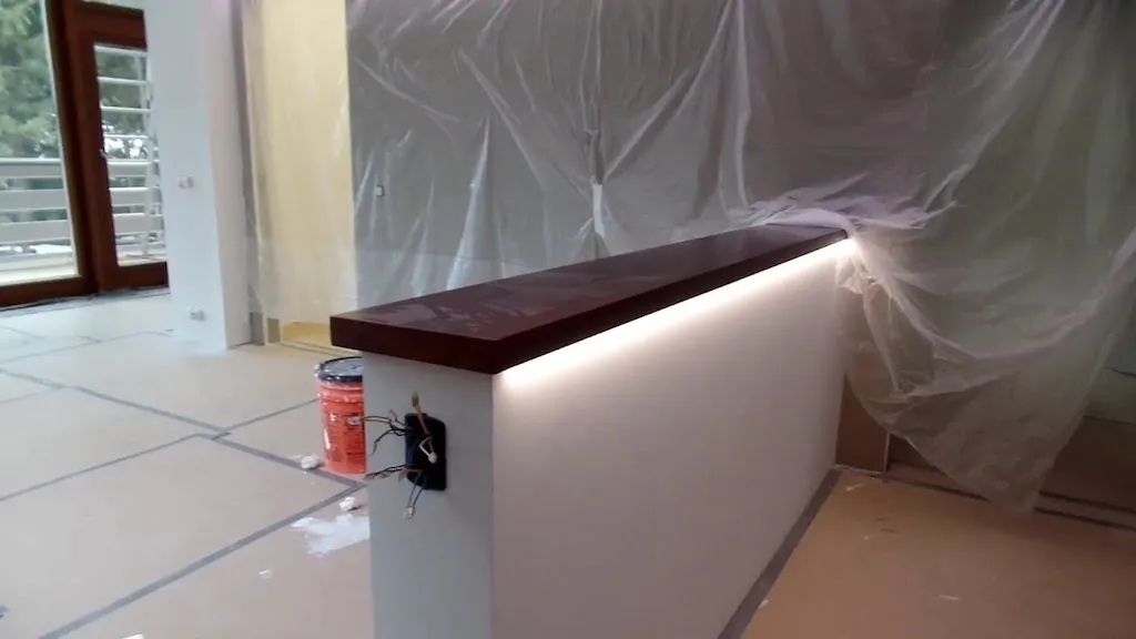 После нанесения декоративного покрытия, барная стойка из гипсокартона почти готова. Остается смонтировать подсветку, если она предусмотрена, и установить столешницу. К качеству столешницы предъявляются особые требования. Она должна быть выполнена из влагостойкого материала, не поддающегося деформации в процессе эксплуатации. На столешнице можно закрепить стойки и дополнительные полочки.