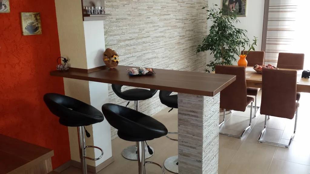 - Двухуровневый вариант. Чаще всего при выборе совмещенной барной стойки с обеденной зоной, подразумевается исполнение конструкции в двух уровнях: барная стойка будет выше, чем обеденный стол. Такой вариант весьма удобен для зонирования помещения, когда обеденная зона располагается со стороны кухни, а барная стойка – со стороны гостиной.