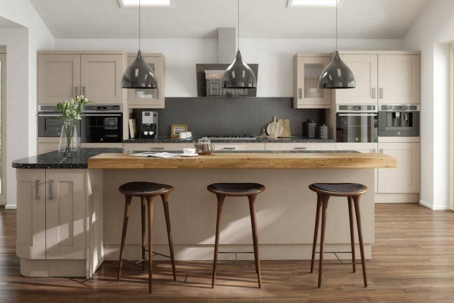 Комбинированные. В этом варианте столешница стойки примыкает к рабочей поверхности, но имеет другую высоту. Обычно рабочая поверхность направлена при этом в сторону кухни, а более высокая барная – в сторону столовой зоны.