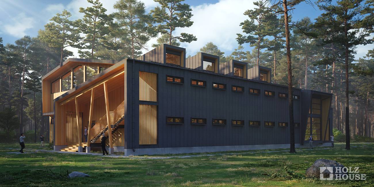 Барнхаус S 37,5 м2мини домов. Это маленькие постройки, рассчитанные на проживание 1-2 человек. Как правило, именно такие дома выполняются по модульным технологиям. То есть полное изготовление конструкции в цеху, а на участок уже привозится готовый дом. Единственное условие для такого сооружения — относительно ровная поверхность территории, так как фундамент по него не выполняется. Мини дом — отличное решение для временного проживания, когда земля уже куплена, а капитальная застройка еще в процессе. Кроме того, такой дом можно в последующем переместить и использовать как гостевой или продать.