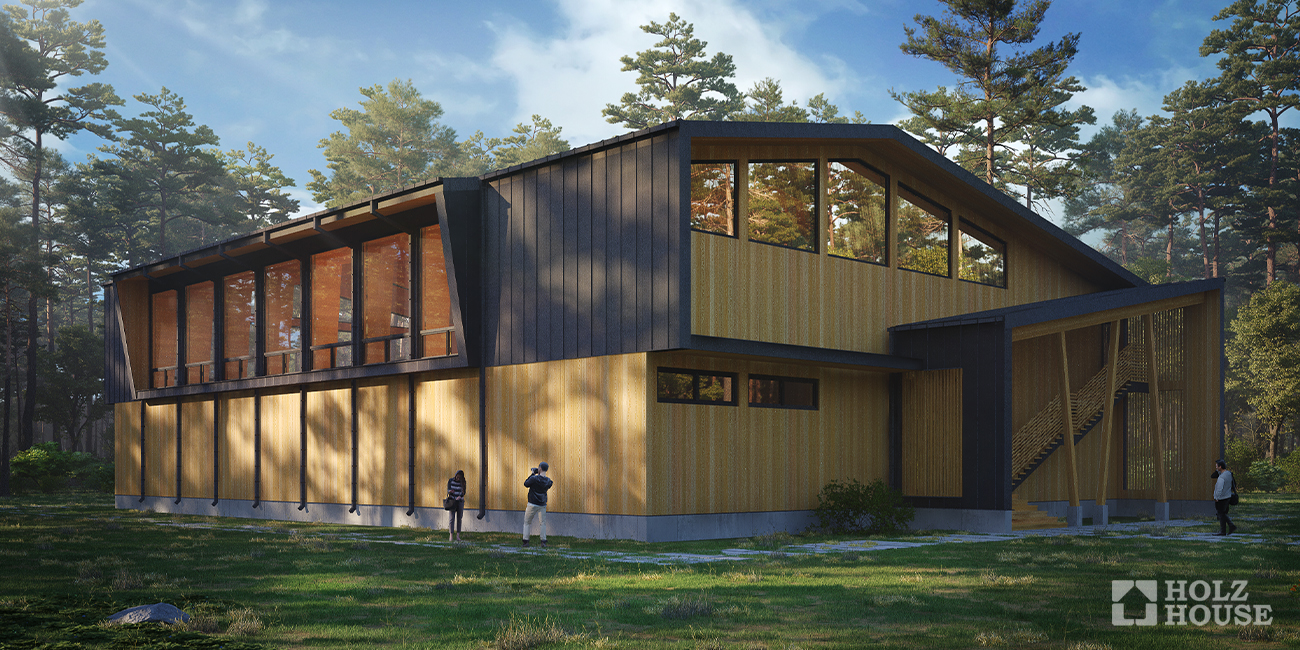 Окна делаются панорамными, они занимают одну или две торцевые стены. Часто плоскость одного окна распространяется и на мансардный этаж. Крыша двухскатная. С нее скатывается вода и снег. Второй этаж становится достаточно сложным при выборе мебели, невозможно поставить высокие шкафы или иные объекты. Обычно там располагаются книжные шкафы или дополнительные спальные места.
